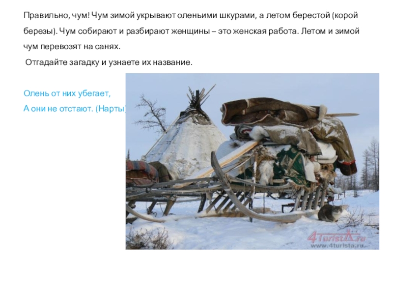 Слайд 30Правильно, чум! Чум зимой укрывают оленьими шкурами, а летом берестой (корой