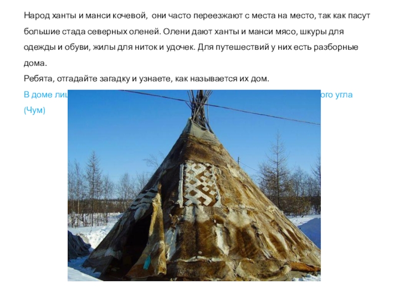 место, так как пасут большие стада северных оленей. Олени дают ханты и манси мясо, шкуры для одежды и обуви, жилы для ниток и удочек. Для путешествий у них есть разборные дома.