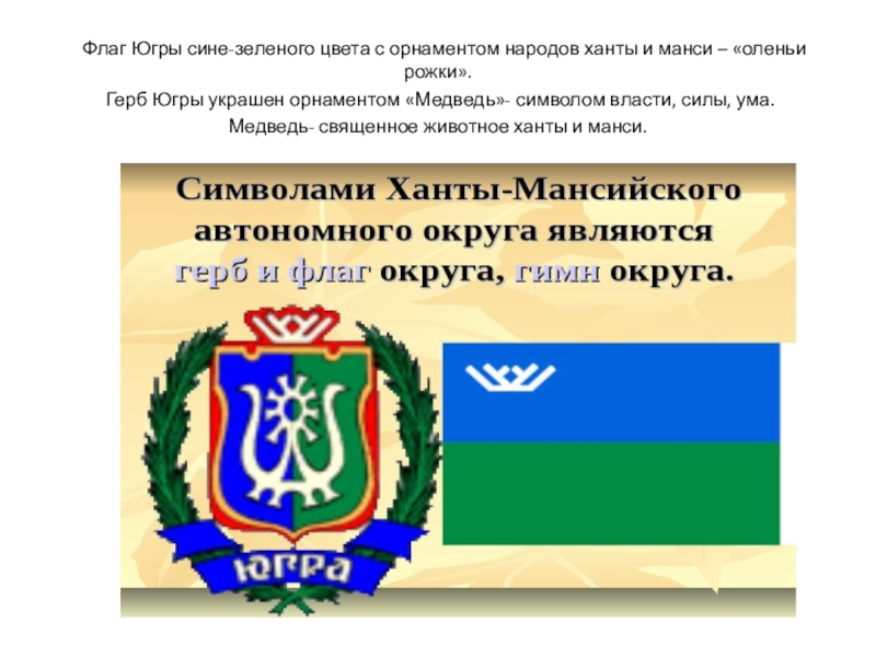 Герб Югры украшен орнаментом «Медведь»- символом власти, силы, ума.
