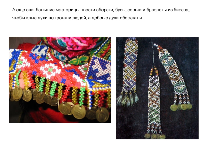 Слайд 32А еще они большие мастерицы плести обереги, бусы, серьги и браслеты