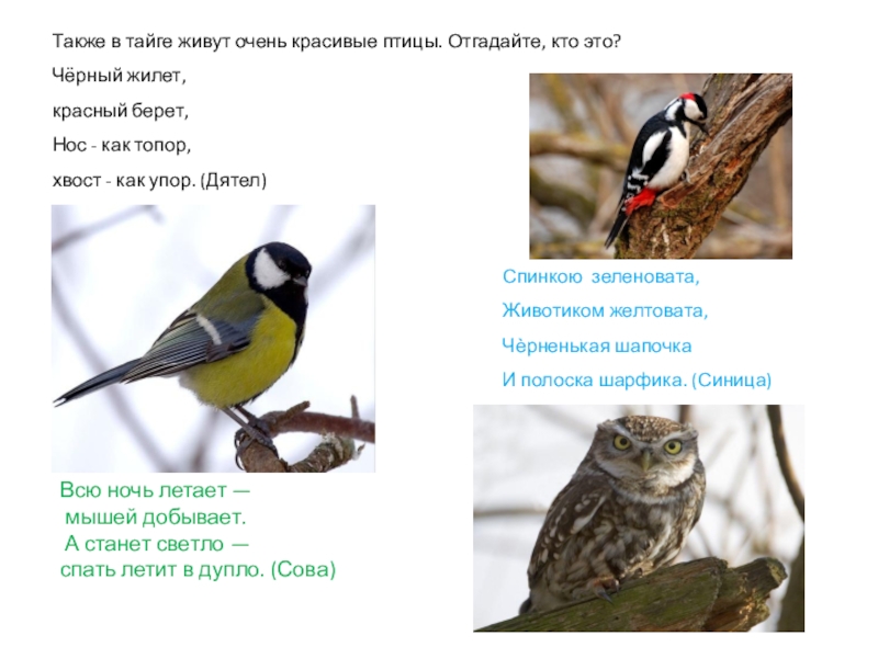 Слайд 24Также в тайге живут очень красивые птицы. Отгадайте, кто это?