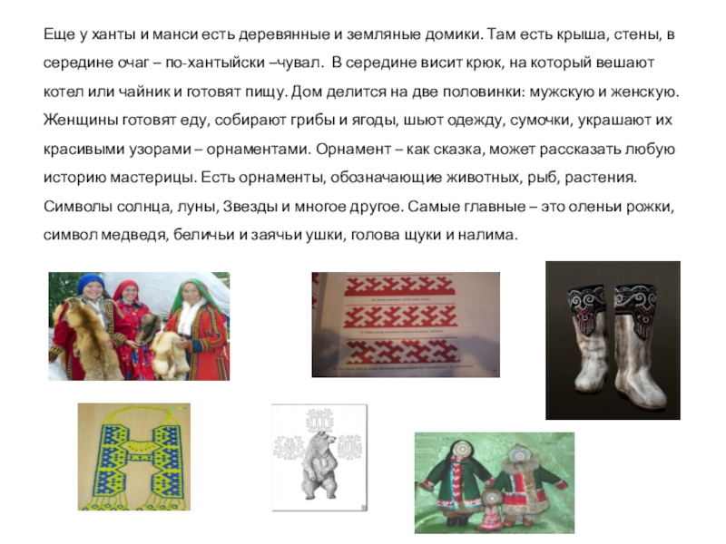 есть крыша, стены, в середине очаг – по-хантыйски –чувал. В середине висит крюк, на который вешают котел или чайник и готовят пищу. Дом делится на две половинки: мужскую и женскую. Женщины готовят еду, собирают грибы и ягоды, шьют одежду, сумочки, украшают их красивыми узорами – орнаментами. Орнамент – как сказка, может рассказать любую историю мастерицы. Есть орнаменты, обозначающие животных, рыб, растения. Символы солнца, луны, Звезды и многое другое. Самые главные – это оленьи рожки, символ медведя, беличьи и заячьи ушки, голова щуки и налима.