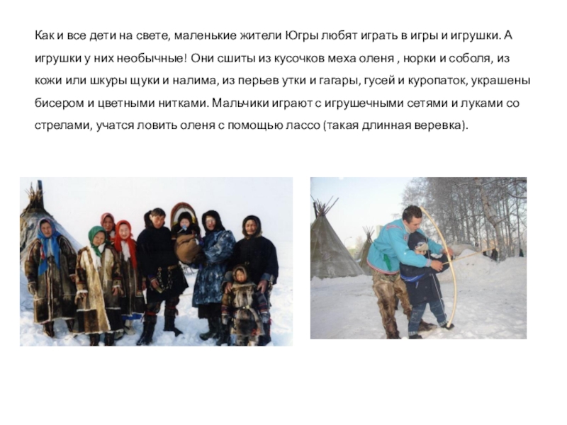 в игры и игрушки. А игрушки у них необычные! Они сшиты из кусочков меха оленя , норки и соболя, из кожи или шкуры щуки и налима, из перьев утки и гагары, гусей и куропаток, украшены бисером и цветными нитками. Мальчики играют с игрушечными сетями и луками со стрелами, учатся ловить оленя с помощью лассо (такая длинная веревка).