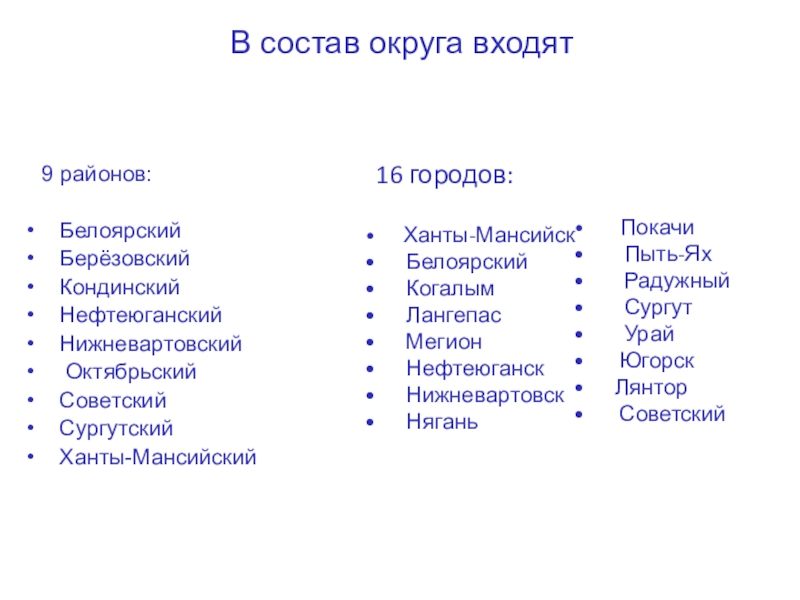 вы знаете: это Сургут, Нижневартовск, Мегион, Пыть – Ях, Лангепас, Когалым и другие.