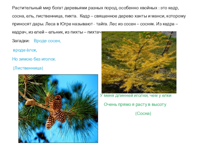 сосна, ель, лиственница, пихта. Кедр – священное дерево ханты и манси, которому приносят дары. Леса в Югре называют - тайга. Лес из сосен – сосняк. Из кедра – кедрач, из елей – ельник, из пихты – пихтач.