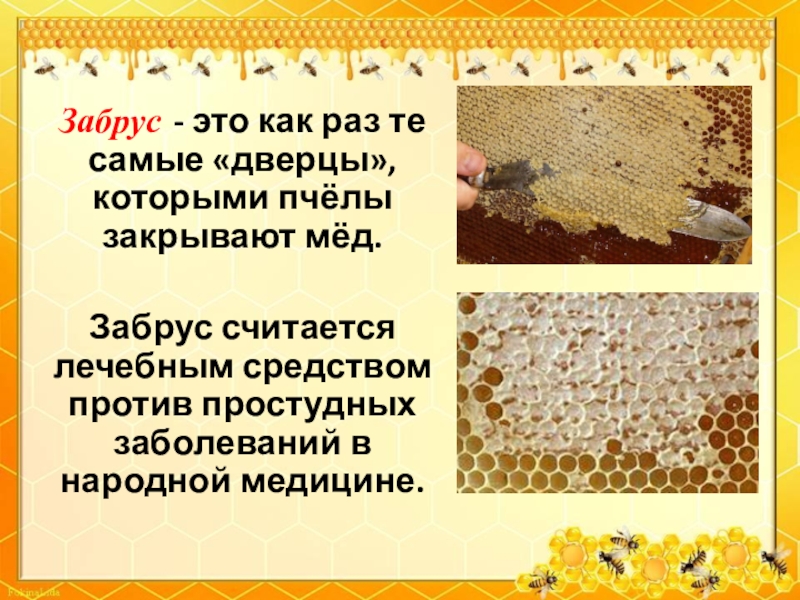 Слайд 28Забрус - это как раз те самые «дверцы», которыми пчёлы закрывают