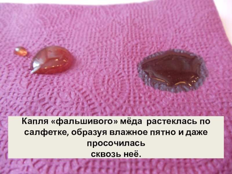 Слайд 50Капля настоящего мёда не растеклась, даже спустя некоторое время.