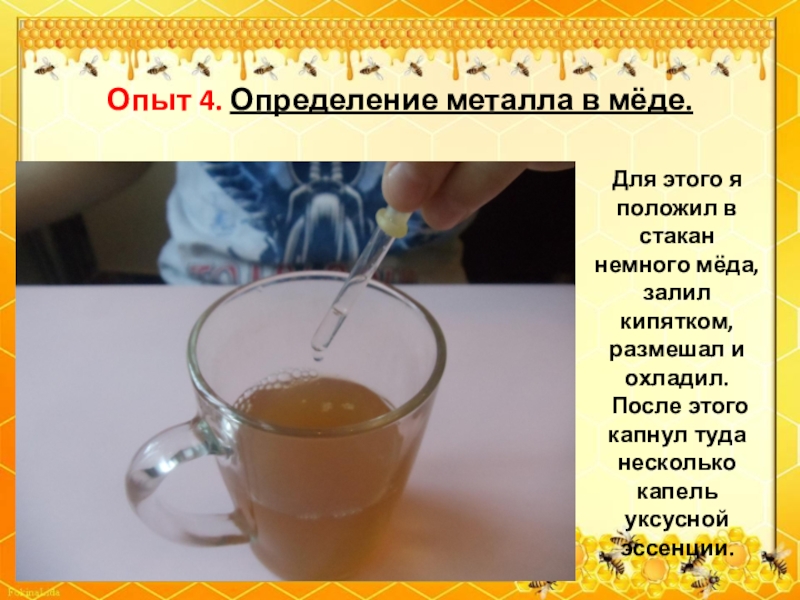 Слайд 52Опыт 4. Определение металла в мёде.