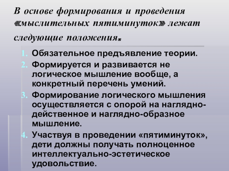 Слайд 24В основе формирования и проведения «мыслительных пятиминуток» лежат следующие положения.