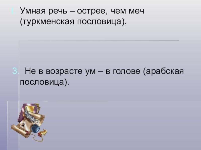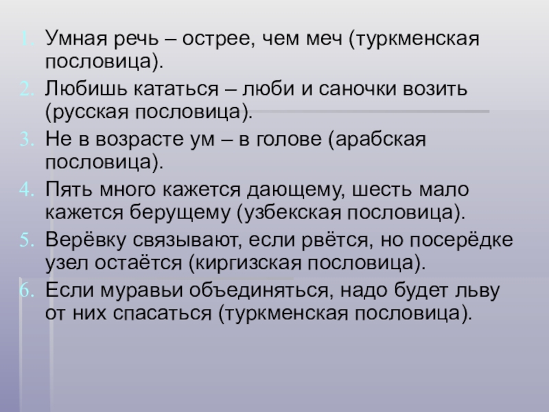 Слайд 8Умная речь – острее, чем меч (туркменская пословица).
