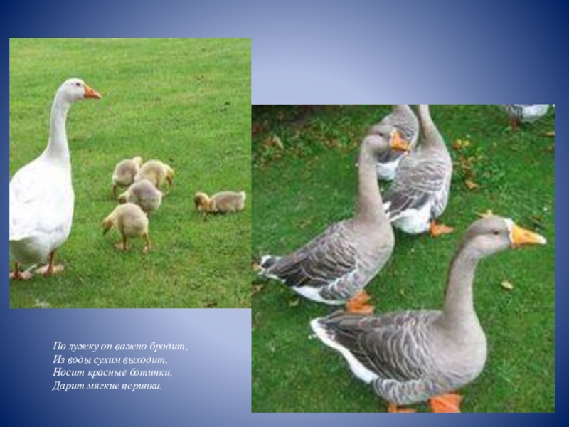 По лужку он важно бродит,Из воды сухим выходит,Носит красные ботинки,Дарит мягкие перинки.