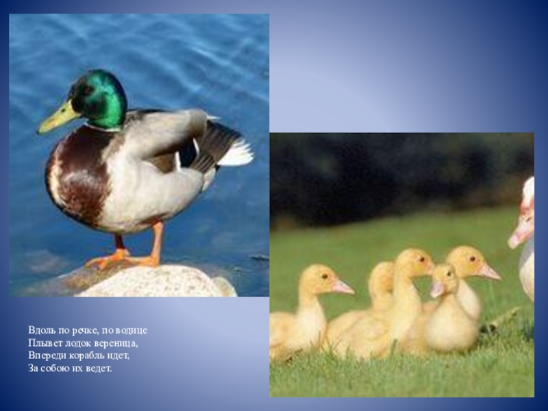 Вдоль по речке, по водицеПлывет лодок вереница,Впереди корабль идет,За собою их ведет.
