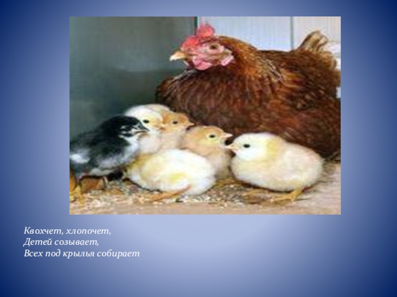 Квохчет, хлопочет,Детей созывает,Всех под крылья собирает