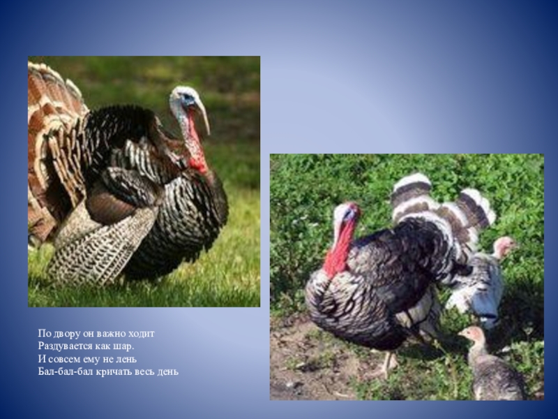 По двору он важно ходитРаздувается как шар.И совсем ему не леньБал-бал-бал кричать весь день