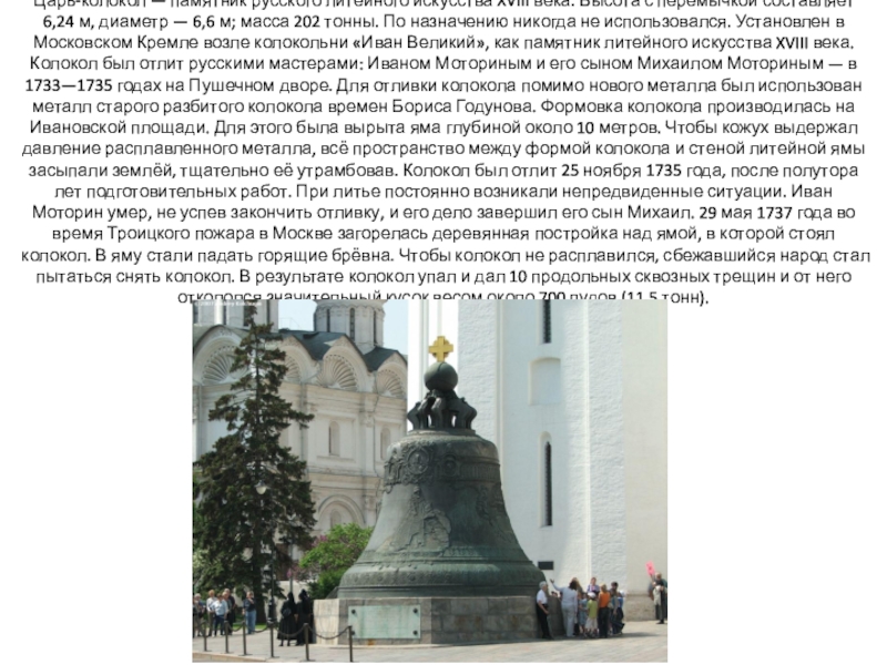 Слайд 11Царь-ко́локол — памятник русского литейного искусства XVIII века. Высота с перемычкой