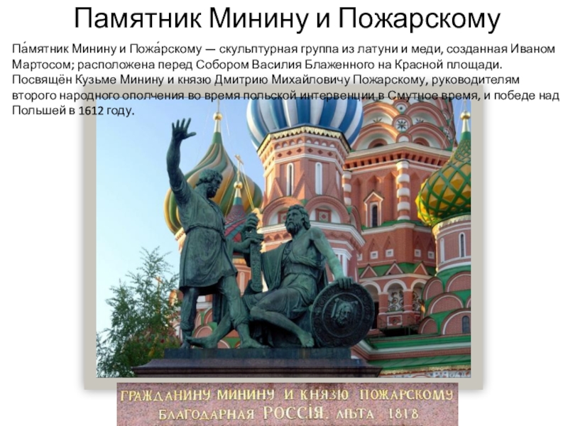 латуни и меди, созданная Иваном Мартосом; расположена перед Собором Василия Блаженного на Красной площади. Посвящён Кузьме Минину и князю Дмитрию Михайловичу Пожарскому, руководителям второго народного ополчения во время польской интервенции в Смутное время, и победе над Польшей в 1612 году.