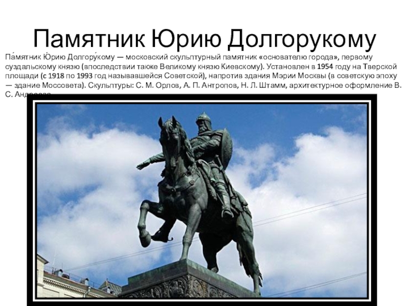 первому суздальскому князю (впоследствии также Великому князю Киевскому). Установлен в 1954 году на Тверской площади (c 1918 по 1993 год называвшейся Советской), напротив здания Мэрии Москвы (в советскую эпоху — здание Моссовета). Скульптуры: С. М. Орлов, А. П. Антропов, Н. Л. Штамм, архитектурное оформление В. С. Андреева.