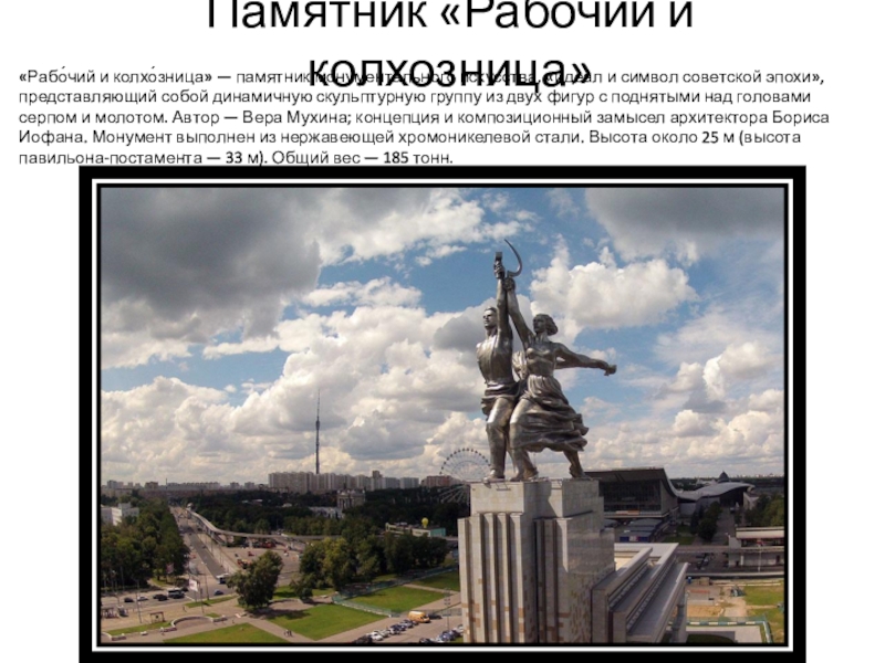 и символ советской эпохи», представляющий собой динамичную скульптурную группу из двух фигур с поднятыми над головами серпом и молотом. Автор — Вера Мухина; концепция и композиционный замысел архитектора Бориса Иофана. Монумент выполнен из нержавеющей хромоникелевой стали. Высота около 25 м (высота павильона-постамента — 33 м). Общий вес — 185 тонн.