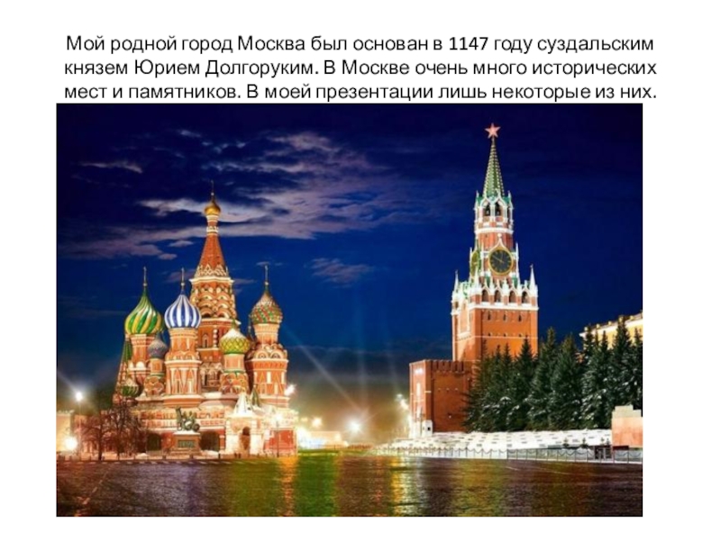 Юрием Долгоруким. В Москве очень много исторических мест и памятников. В моей презентации лишь некоторые из них.