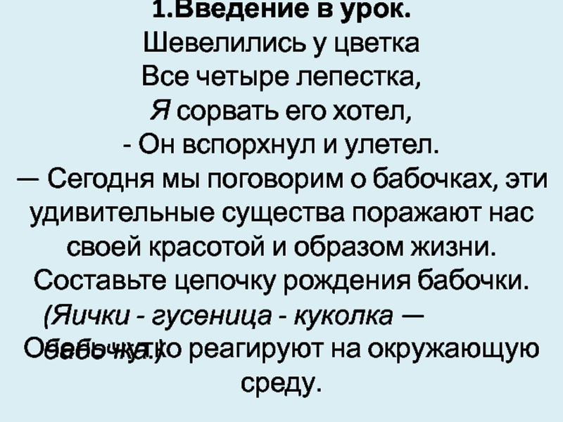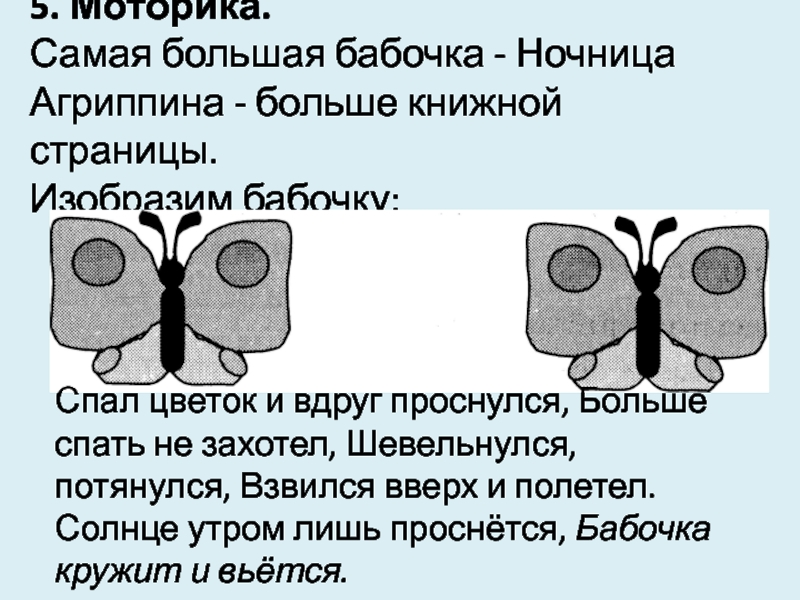 Спал цветок и вдруг проснулся, Больше спать не захотел, Шевельнулся, потянулся, Взвился вверх и полетел. Солнце утром лишь проснётся, Бабочка кружит и вьётся.