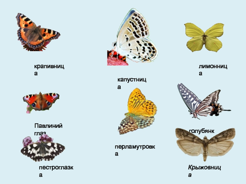 (Махаон — розы; Бражник — тюльпан; Павлиний глаз — ромашка.)