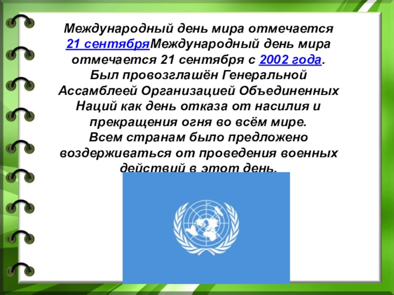 Международный день мира отмечается 21 сентябряМеждународный день мира отмечается 21 сентября с 2002 года. Был провозглашён Генеральной