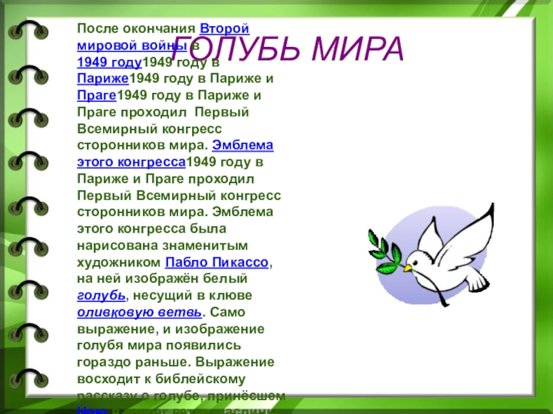 Париже1949 году в Париже и Праге1949 году в Париже и Праге проходил Первый Всемирный конгресс сторонников мира. Эмблема этого конгресса1949 году в Париже и Праге проходил Первый Всемирный конгресс сторонников мира. Эмблема этого конгресса была нарисована знаменитым художником Пабло Пикассо, на ней изображён белый голубь, несущий в клюве оливковую ветвь. Само выражение, и изображение голубя мира появились гораздо раньше. Выражение восходит к библейскому рассказу о голубе, принёсшем Ною в ковчег ветвь маслины.