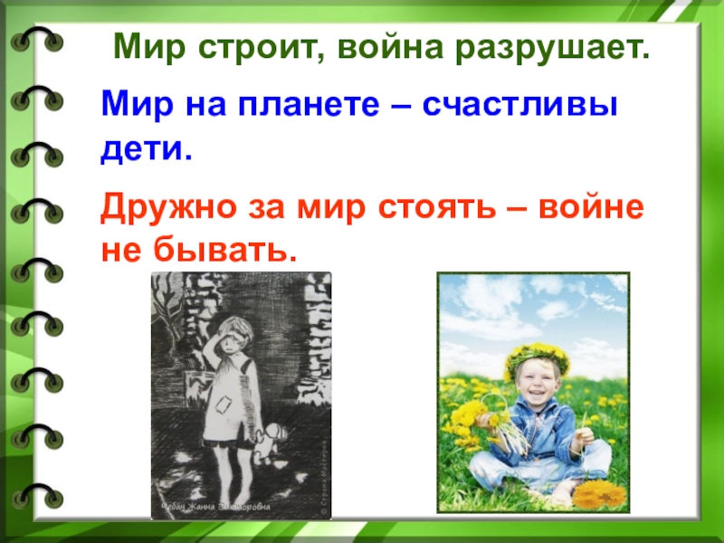 Мир строит, война разрушает. Мир на планете – счастливы дети. Дружно за мир стоять – войне не бывать.