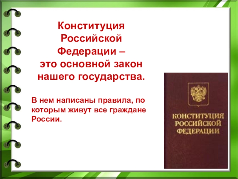 Конституция Российской Федерации – это основной закон нашего государства.В нем написаны правила, по которым живут все граждане
