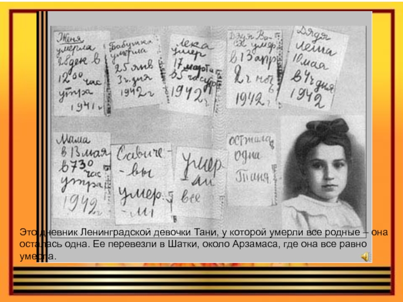 Это дневник Ленинградской девочки Тани, у которой умерли все родные – она осталась одна. Ее перевезли в