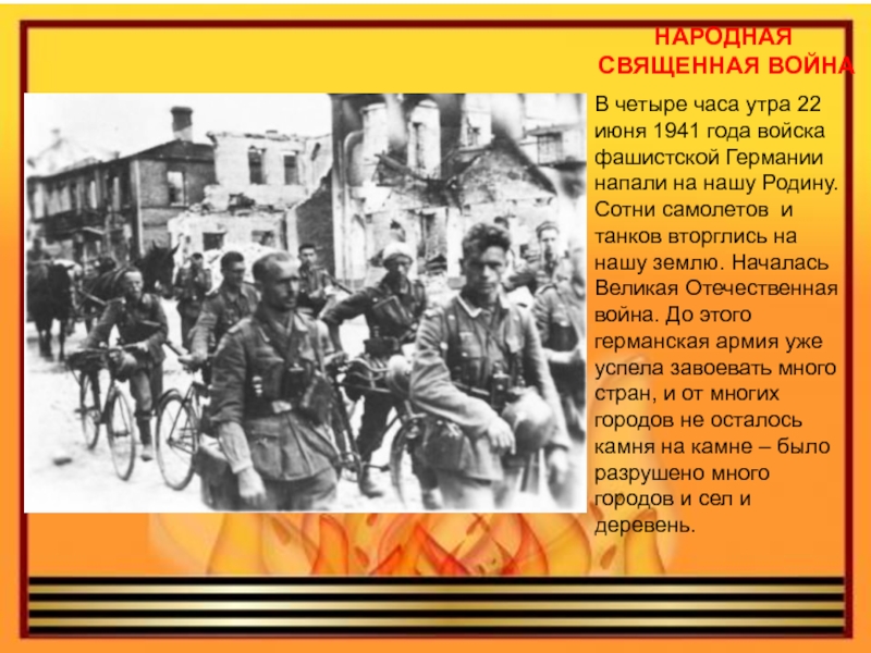 НАРОДНАЯ СВЯЩЕННАЯ ВОЙНАВ четыре часа утра 22 июня 1941 года войска фашистской Германии напали на нашу Родину. Сотни самолетов и танков вторглись на нашу землю. Началась Великая Отечественная война. До этого германская армия уже успела завоевать