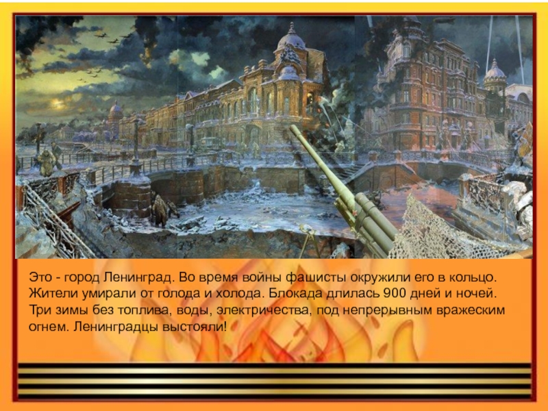 кольцо. Жители умирали от голода и холода. Блокада длилась 900 дней и ночей. Три зимы без топлива, воды, электричества, под непрерывным вражеским огнем. Ленинградцы выстояли!