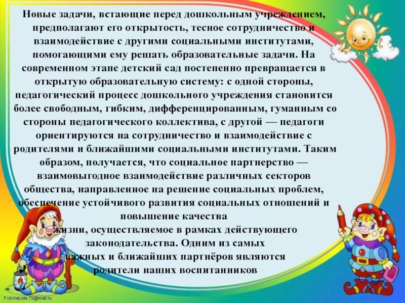 Слайд 3Новые задачи, встающие перед дошкольным учреждением, предполагают его открытость, тесное сотрудничество