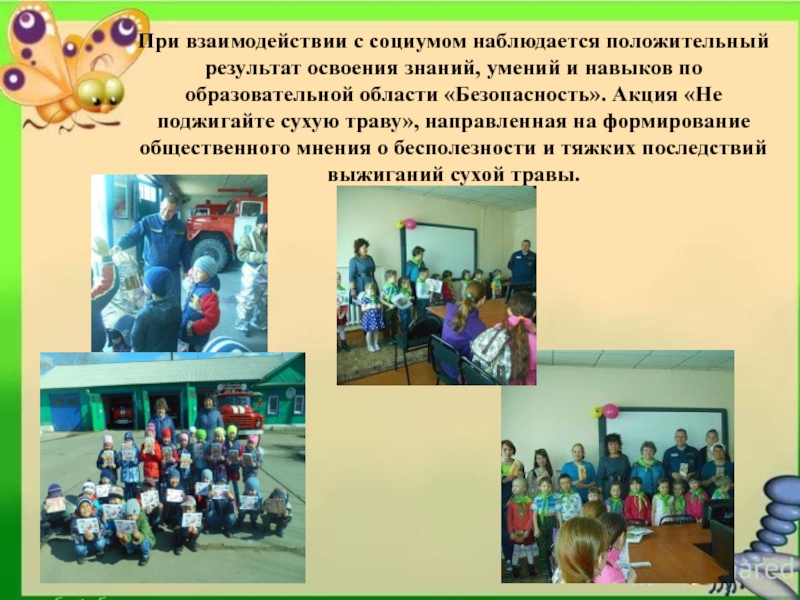 навыков по образовательной области «Безопасность». Акция «Не поджигайте сухую траву», направленная на формирование общественного мнения о бесполезности и тяжких последствий выжиганий сухой травы.