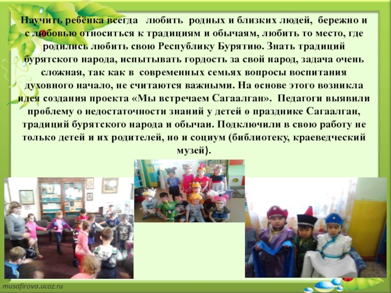 с любовью относиться к традициям и обычаям, любить то место, где родились любить свою Республику Бурятию. Знать традиций бурятского народа, испытывать гордость за свой народ, задача очень сложная, так как в современных семьях вопросы воспитания духовного начало, не считаются важными. На основе этого возникла идея создания проекта «Мы встречаем Сагаалган». Педагоги выявили проблему о недостаточности знаний у детей о празднике Сагаалган, традиций бурятского народа и обычаи. Подключили в свою работу не только детей и их родителей, но и социум (библиотеку, краеведческий музей).