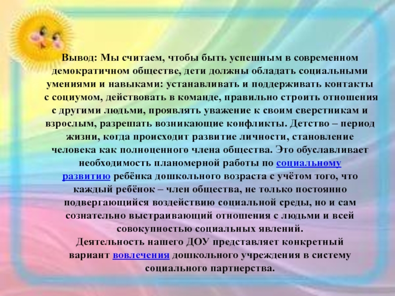 должны обладать социальными умениями и навыками: устанавливать и поддерживать контакты с социумом, действовать в команде, правильно строить отношения с другими людьми, проявлять уважение к своим сверстникам и взрослым, разрешать возникающие конфликты. Детство – период жизни, когда происходит развитие личности, становление человека как полноценного члена общества. Это обуславливает необходимость планомерной работы по социальному развитию ребёнка дошкольного возраста с учётом того, что каждый ребёнок – член общества, не только постоянно подвергающийся воздействию социальной среды, но и сам сознательно выстраивающий отношения с людьми и всей совокупностью социальных явлений.