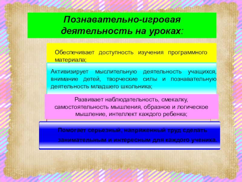 Активизирует мыслительную деятельность учащихся, внимание детей, творческие силы и познавательную деятельность младшего школьника;