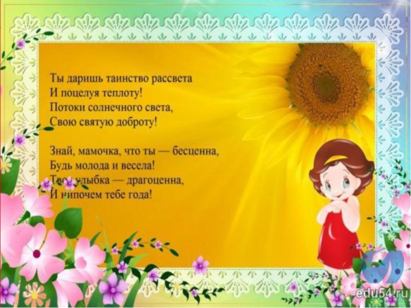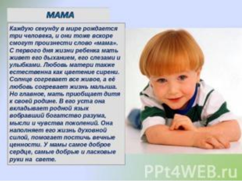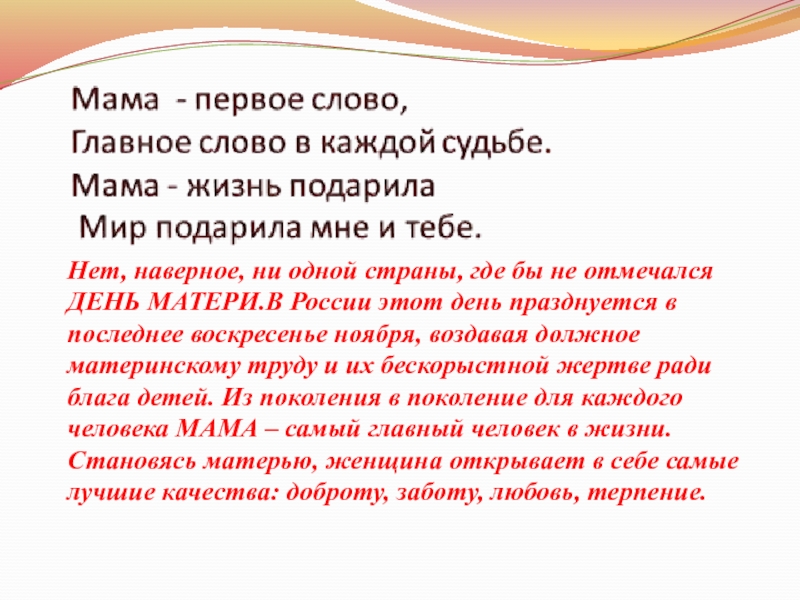 России этот день празднуется в последнее воскресенье ноября, воздавая должное материнскому труду и их бескорыстной жертве ради блага детей. Из поколения в поколение для каждого человека МАМА – самый главный человек в жизни. Становясь матерью, женщина открывает в себе самые лучшие качества: доброту, заботу, любовь, терпение.