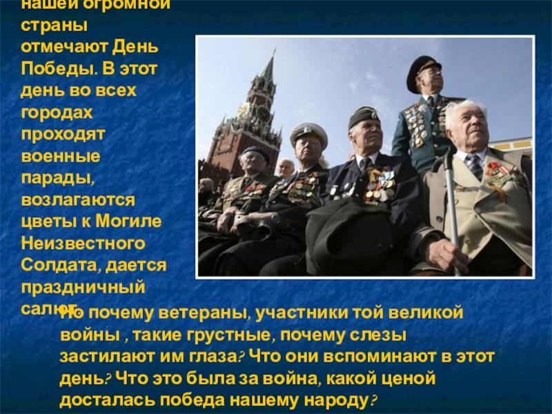 Но почему ветераны, участники той великой войны , такие грустные, почему слезы застилают им глаза? Что они вспоминают в этот день? Что это была за война, какой ценой досталась победа нашему народу?
