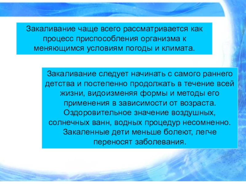 Закаливание следует начинать с самого раннего детства и постепенно продолжать в течение всей жизни, видоизменяя формы и методы его применения в зависимости от возраста. Оздоровительное значение воздушных, солнечных ванн, водных процедур несомненно. Закаленные дети меньше болеют, легче переносят заболевания.