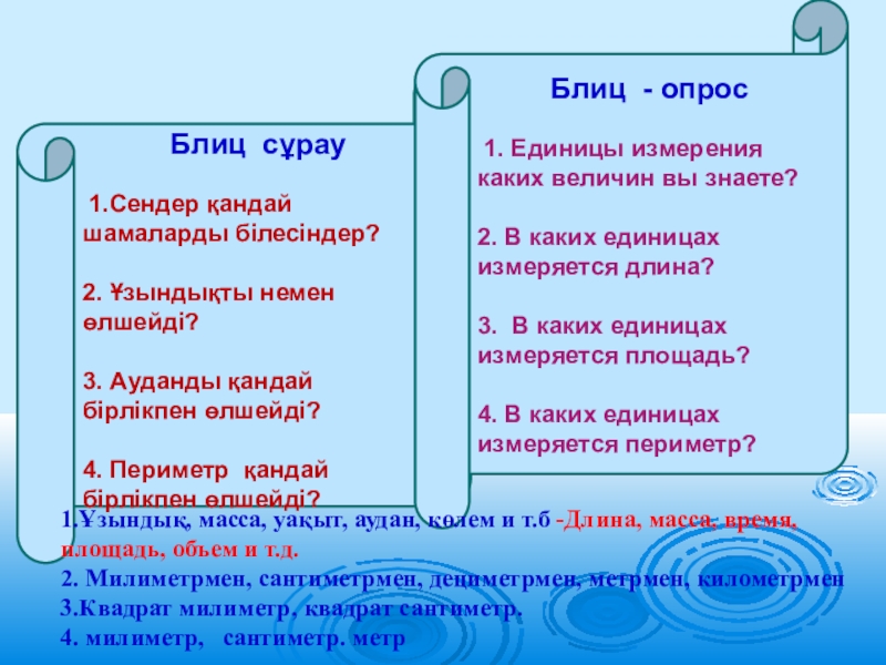 1.Ұзындық, масса, уақыт, аудан, көлем и т.б -Длина, масса, время, площадь, объем и т.д.