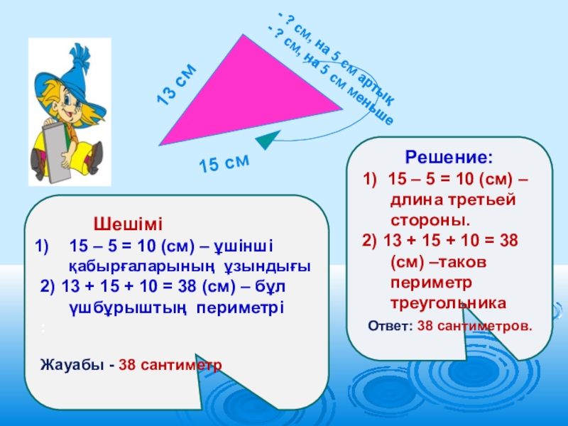 15 – 5 = 10 (см) – ұшінші қабырғаларының ұзындығы