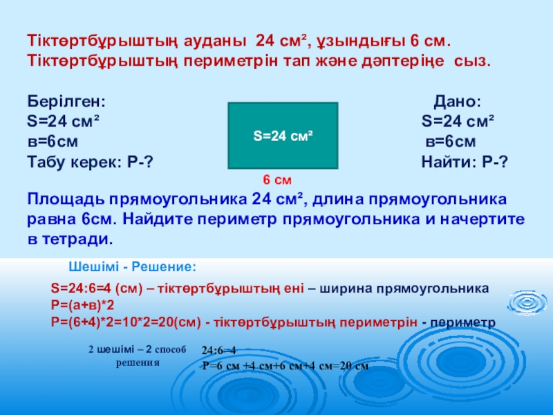 S=24:6=4 (см) – тіктөртбұрыштың ені – ширина прямоугольника