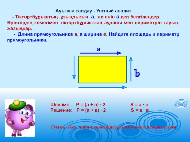 Решение: Р = (а + в) ∙ 2 S = а ∙ в