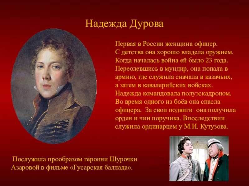 Послужила прообразом героини Шурочки Азаровой в фильме «Гусарская баллада».