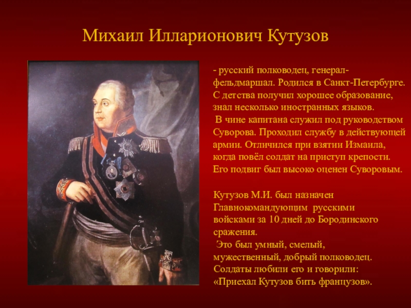 Кутузов М.И. был назначен Главнокомандующим русскими войсками за 10 дней до Бородинского сражения.