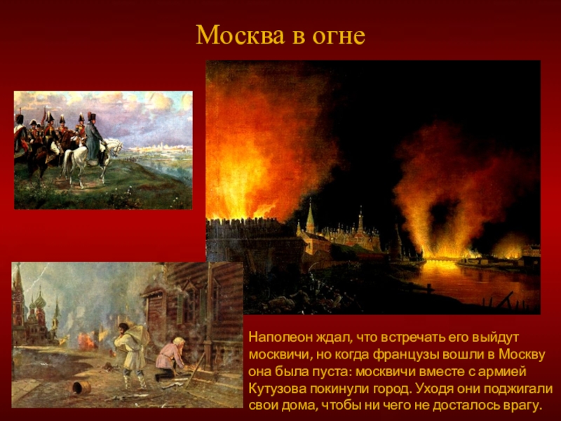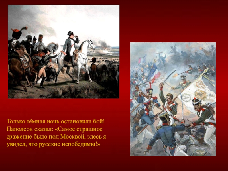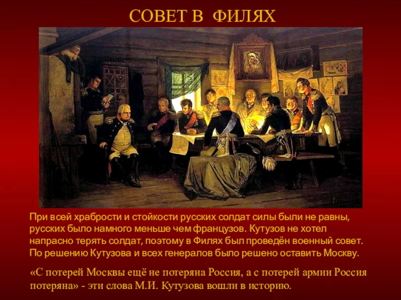 При всей храбрости и стойкости русских солдат силы были не равны, русских было намного меньше чем французов. Кутузов не хотел напрасно терять солдат, поэтому в Филях был проведён военный совет. По решению Кутузова и всех генералов было решено оставить Москву.