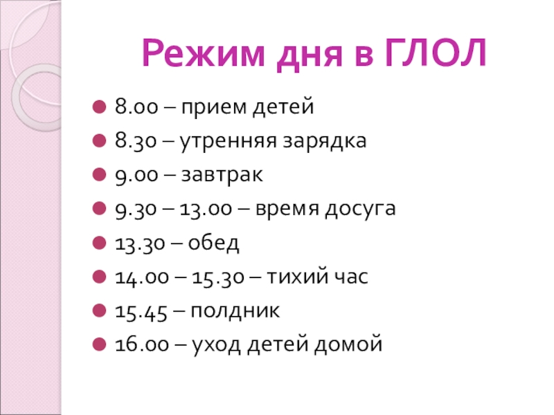 Слайд 22Режим дня в ГЛОЛ