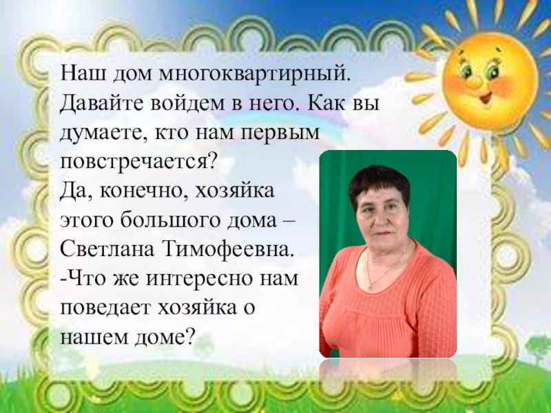 Да, конечно, хозяйка этого большого дома – Светлана Тимофеевна. -Что же интересно нам поведает хозяйка о нашем доме?