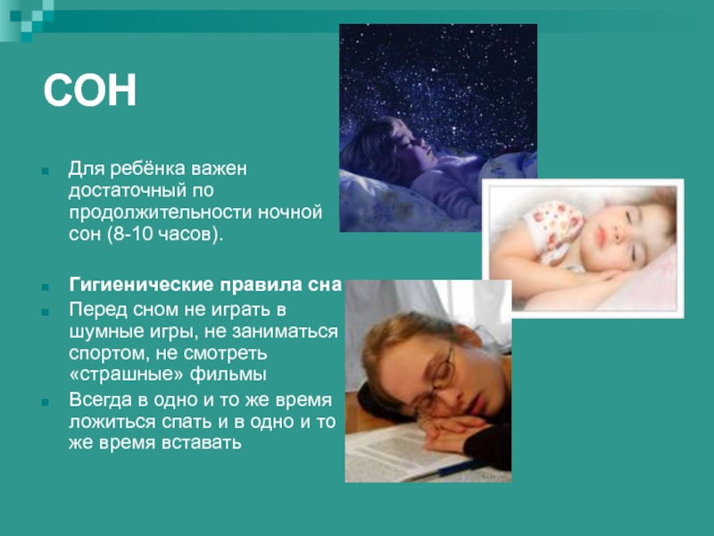 Для ребёнка важен достаточный по продолжительности ночной сон (8-10 часов).